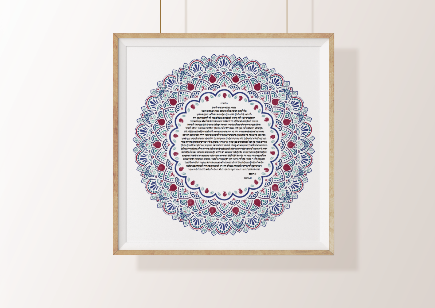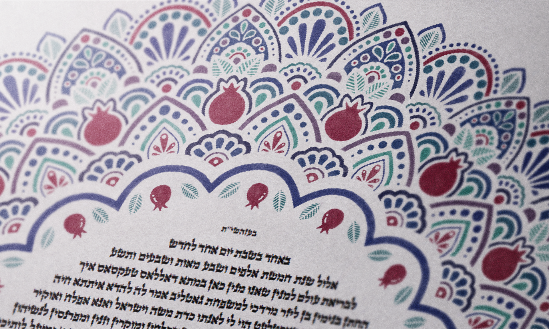 Modern arabesque design with bold pomegranates, a symbol of abundance. In Jewish tradition, it is said to have 613 seeds, each representing one of the 613 mitzvot (commandments) of the Torah.