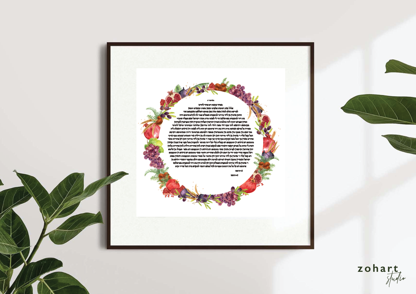 Celebrates a watercolour painted still life comprising of the 7 biblical Israeli species: wheat, barley, grapes, figs, olives and dates and pomegranate.